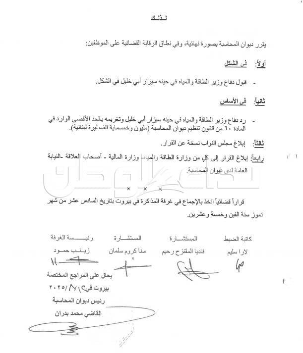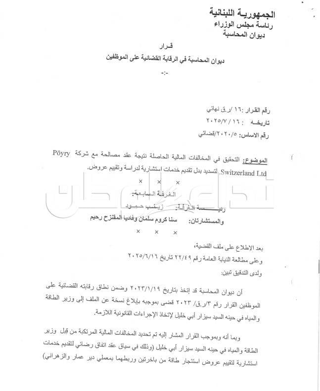 ويأتي القرار النهائي، بعد عامين على «قرار موقت» للديوان، بتاريخ 19/1/2023 حمل الرقم 3/ر.ق 2023، كان قد حدد «المخالفات المالية المرتكبة من قبل أبي خليل في سياق عقد اتفاق رضائي لتقديم خدمات استشارية لتقييم عروض استئجار طاقة من باخرتين وربطهما بمعملي دير عمار والزهراني.