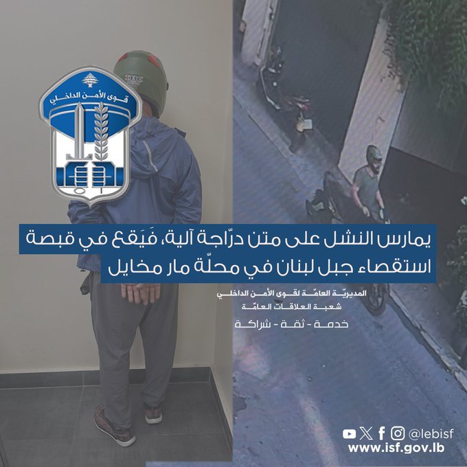 في إطار المكافحة المستمرّة لكل أنواع الجرائم، من قبل القطعات المختصّة في قوى الأمن الدّاخلي، توافرت معلومات لدى مفرزة استقصاء بيروت في وحدة شرطة بيروت، حول إقدام شخص مجهول الهويّة على متن دراجة آليّة من دون لوحة تسجيل، على نشل حقيبة يد لإحدى السّيدات في محلّة مار مخايل، وذلك عند السّاعة 22:40 من تاريخ 13-9-2025. وقد جرى تداول فيديو يُظهِر المشتبه فيه أثناء تنفيذه عمليّة النّشل.