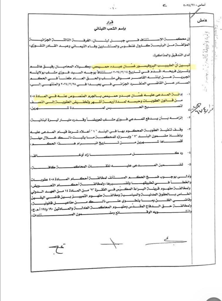 وهذه القضية هي سابقة في قضايا الاخطاء الطبية حيث يمنع الطبيب حميمص من ممارسة مهنة الطب نهائيًا في لبنان بغد ابدانته بجنة شائنة وهي شرط اساسي لاذن مزاولة المهنة.