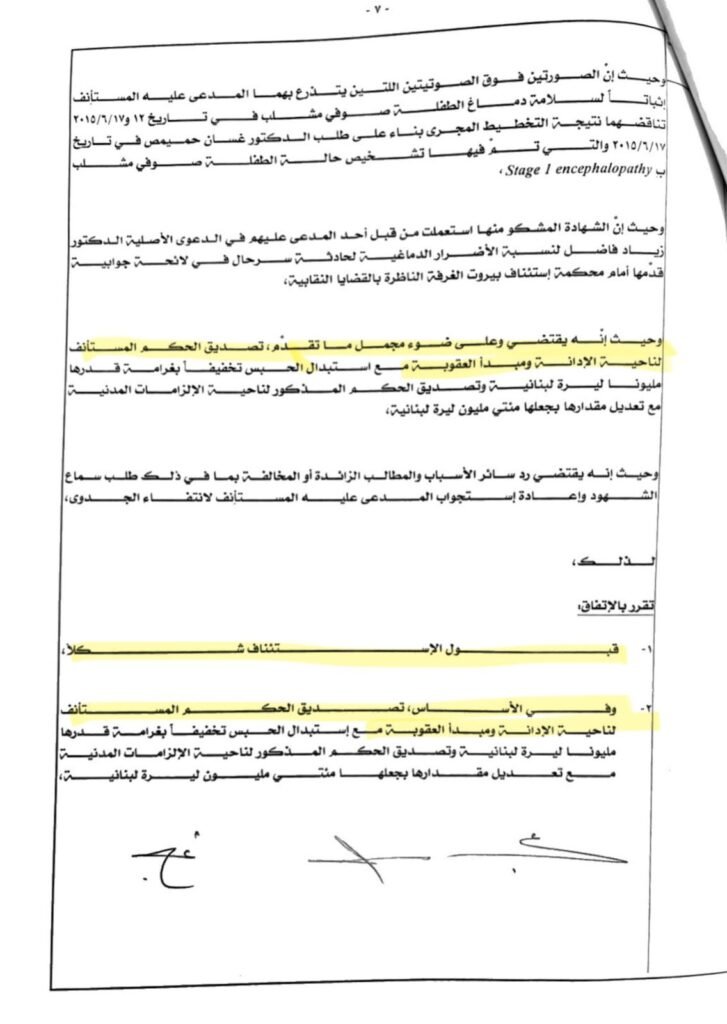 وسيتقدم والد الطفلة فوزي مشلب بقرار المحكمة لكل من وزارة الصحة ونقابة الاطباء لسحب اذن مزاولة المهنة من الطبيب.