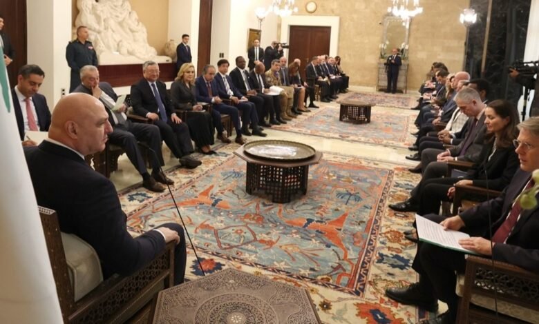 وأكد الوفد الدولي دعمه لاستقرار لبنان وتطبيق القرارات الدولية، فيما شدد رئيس مجلس النواب نبيه بري خلال لقائه الوفد في عين التينة على أن استمرار الاعتداءات الإسرائيلية يجدد الحرب، معتبراً أنّ تكثيف اجتماعات اللجنة الخماسية يفرض على إسرائيل وقف النار فوراً، ومؤكداً أنّ الاستقرار يبدأ بالتزام إسرائيل بالقرار 1701 والانسحاب خلف الحدود الدولية.