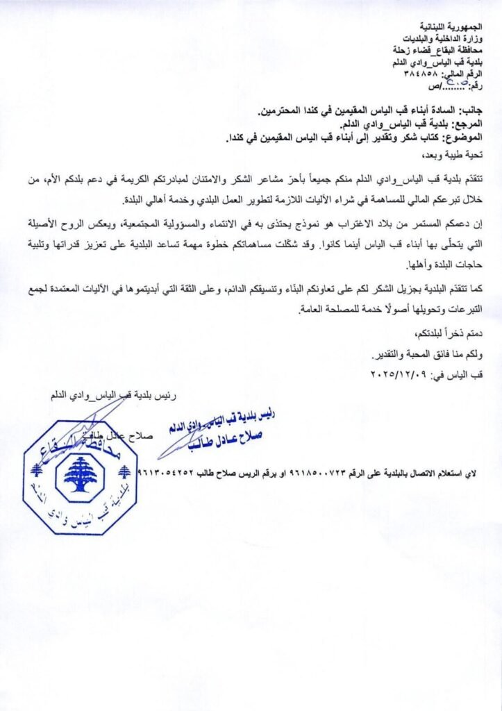 انطلاقًا من مبادئ الشفافية والمسؤولية، وحرصًا على حفظ جهود وحقوق جميع المساهمين، أعلنت بلدية قب الياس – وادي الدلم عن نشر أسماء المتبرعين من أبناء الجالية القب إلياسية في كندا الذين بادروا إلى جمع التبرعات لشراء بيك أب عدد 2 لصالح البلدية.